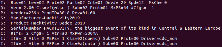 Connect your badge via USB and run `lsusb` or something alternative of `lsusb` in this case I have used `usb-devices` which prints usb device details.